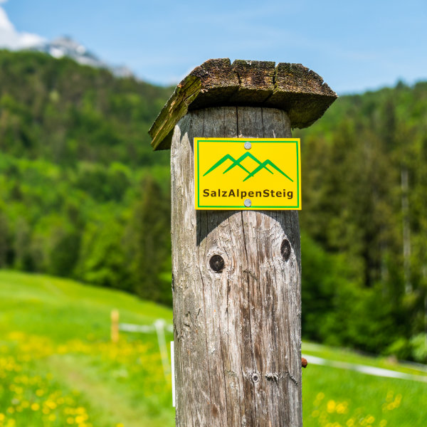 Die Dichte der SalzAlpenSteig-Markierungen erscheint regional etwas dichter als die gewohnte rot-weiß-rote Wegemarkierung.
