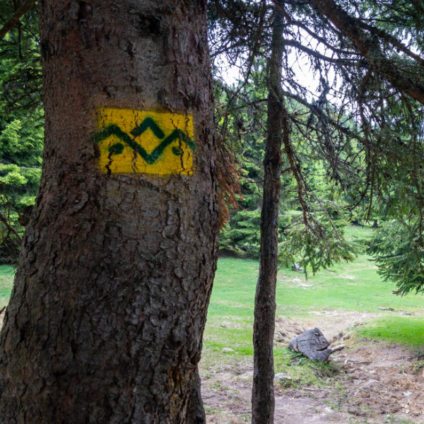 Der allgemeinen ortsüblichen gelben Zielbeschilderung und den Markierungen in der Landschaft (zwischen den Standorten der Beschilderung). Letztere werden entweder auf Bäume (nur Bergsilhouette ohne Schriftzug) gesprüht, auf Pfosten geklebt oder auf Plaketten an Totholz angebracht.